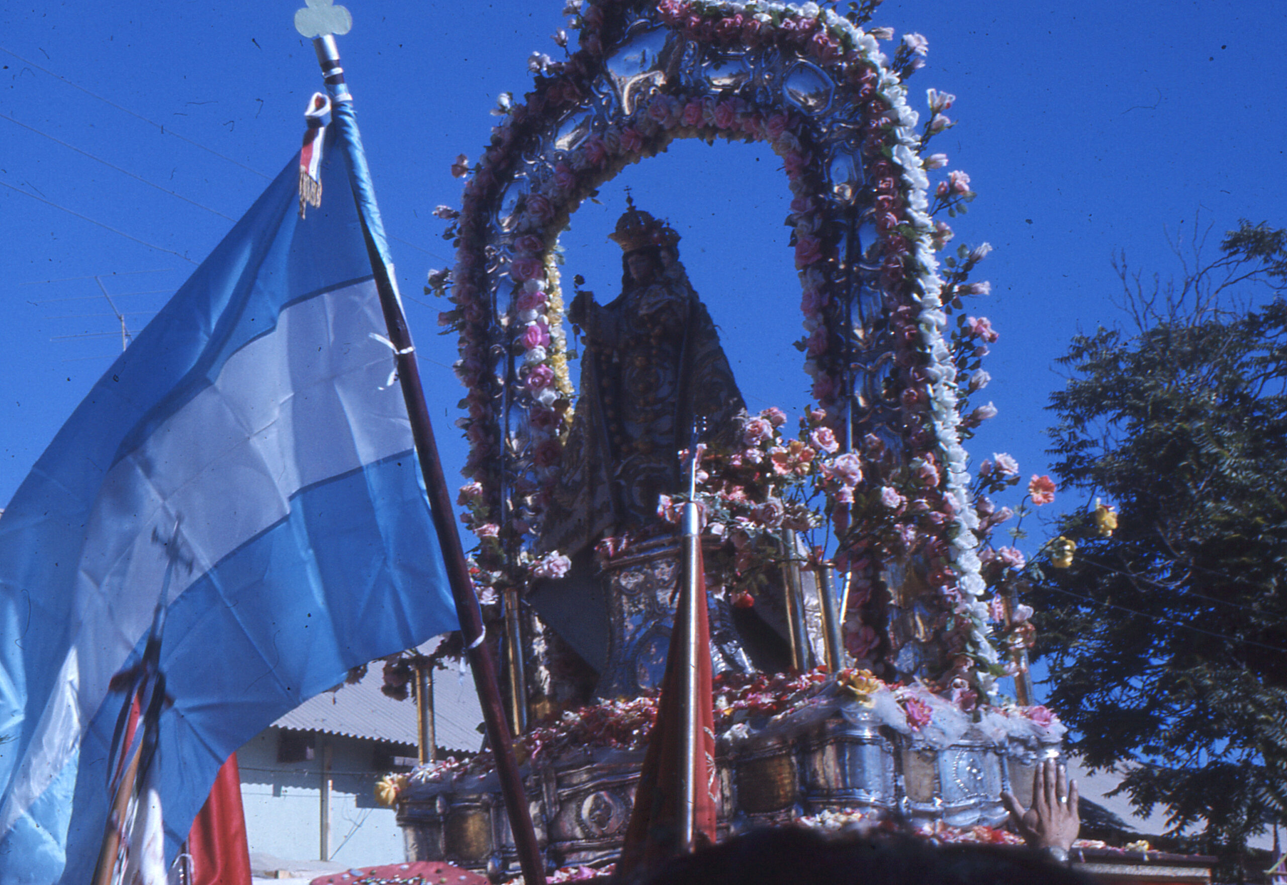 Pero volvamos al cruce de esta información con las fuentes visuales como espacio donde poder buscar algún rastro de la presencia de devotos o peregrinos provenientes de Argentina. La confluencia de peregrinos es una de las características que resaltaban los testimonios de los más antiguos chinos del lugar: a la fiesta venían argentinos, algunos de los cuales incluso se sumaban al baile chino local, denominado “n.º 1 Barrera”. Por eso el procedimiento de análisis visual ha sido buscar en las imágenes un indicio o algo que nos muestre o evidencie lo argentino vinculado a estas tradiciones, siendo el plano más explícito el de las banderas, y el segundo, el de los colores de los trajes de algunos bailes chinos.