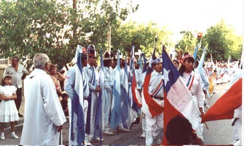 La incorporación de las banderas (en especial de la bandera argentina) se dio al menos en el momento en que dicha fiesta comenzó a realizarse también en las localidades sanjuaninas en el período que abarca fines del xix y la primera mitad del siglo xx, teniendo en cuenta la afirmación de C. Krause sobre el comienzo de la celebración de Los Tambillos cuatro generaciones hacia atrás, ya que el aprendizaje se da de padres a hijos. Estimamos que esta fecha está en directa relación con los datos sobre las migraciones chilenas que decidieron establecerse finalmente en suelo sanjuanino afectadas por las crisis económicas en la iv Región chilena. Se observa entonces en el uso de la bandera una reafirmación de la identidad nacional que reforzaría la diferenciación entre los estados limítrofes. […]. Sin embargo, no parece constituir un problema en esta festividad que quien encabece la danza porte una bandera chilena; podríamos considerar este hecho como un ejemplo de los vínculos históricos con Chile de todo Cuyo en general y de los valles andinos del oeste sanjuanino en particular (Hevilla, 2001a: 460).