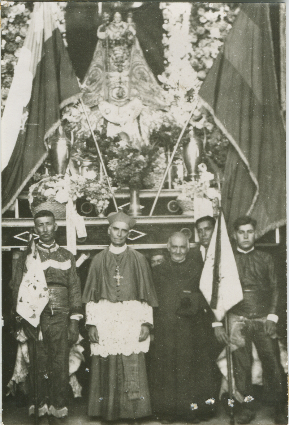 - Imagen 6: fotografía de autoridades rituales y religiosas a los pies de la virgen, durante una fiesta de la década de 1930, siendo don Luis Guzmán el chino que posa junto al obispo de La Serena José María Caro. Archivo Parroquial de Andacollo.