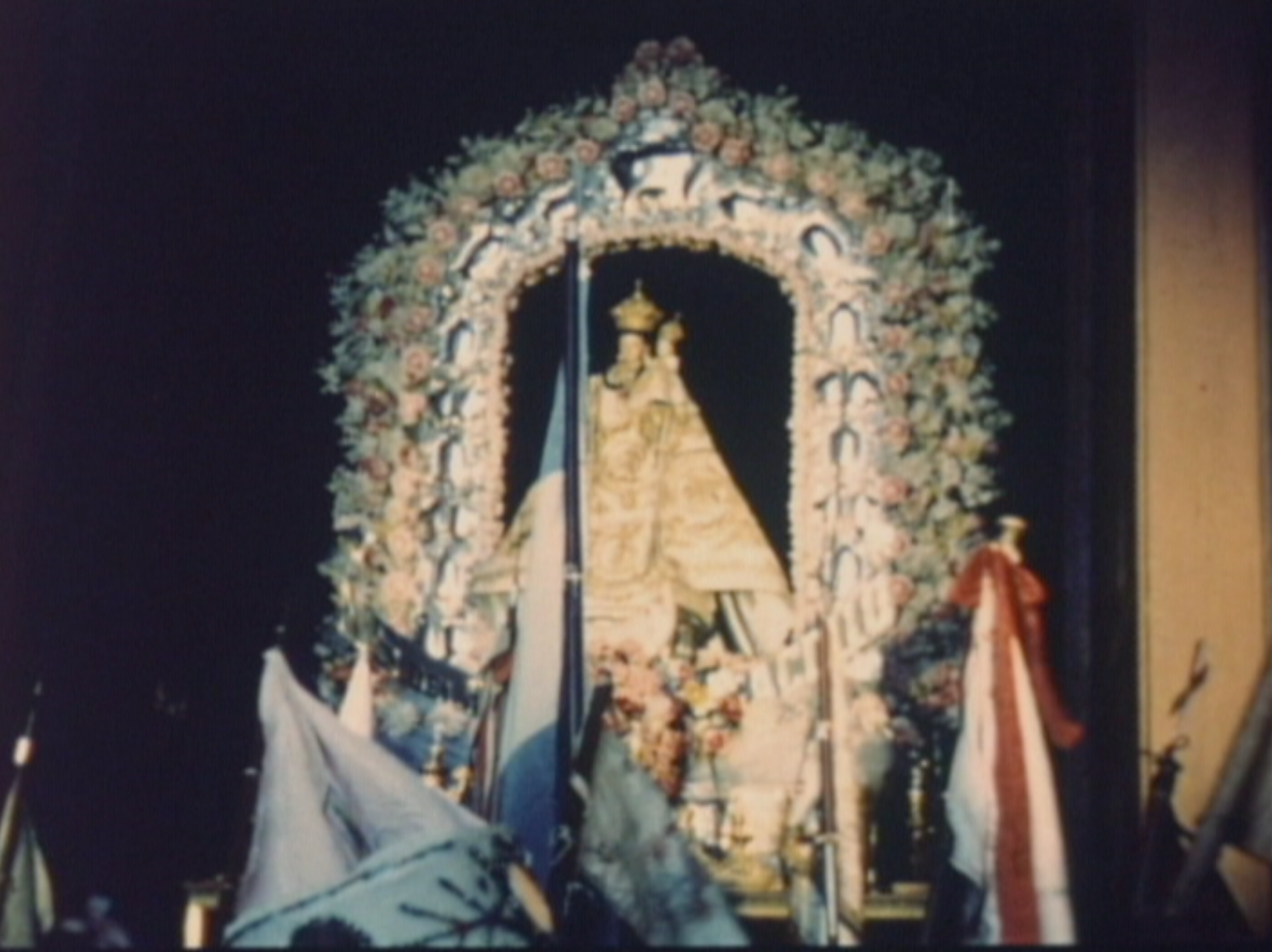 Las tres imágenes siguientes, de la 9 a la 11, corresponden a la captura de tres fotogramas de la película Andacollo, registrada en la fiesta de 1957 por Nieves Yankovic y Jorge di Lauro. Asimismo, las imágenes 12 y 13 corresponden a fotografías de la procesión del 27 de diciembre de 1974, y fueron tomadas por la etnomusicóloga María Ester Grebe, siendo parte del Fondo patrimonial que lleva su nombre en el Departamento de Antropología de la Universidad de Chile. De este conjunto de fuentes visuales que refuerzan la presencia e importancia de los emblemas nacionales argentinos en la fiesta andacollina, resulta significativa, por lo curioso, la imagen 9. Esta nos conecta con una temporalidad de larga duración, del Antiguo Régimen, pues el banderín con los colores hispánicos seguía teniendo fuerza iconográfica hasta el último tercio del siglo xx, e incluso hoy sigue presente en algunos testimonios de antiguos y antiguas devotas, en el sentido de que remarcan un origen diferenciado de las danzas y los turbantes con relación a los bailes chinos, vinculando variaciones estilísticas (de músicas, instrumentos y vestimentas) con diferencias raciales, y las diferencias raciales con grupos sociales y estamentales distintos, coherente con el sistema estamental de naciones y castas coloniales[12].