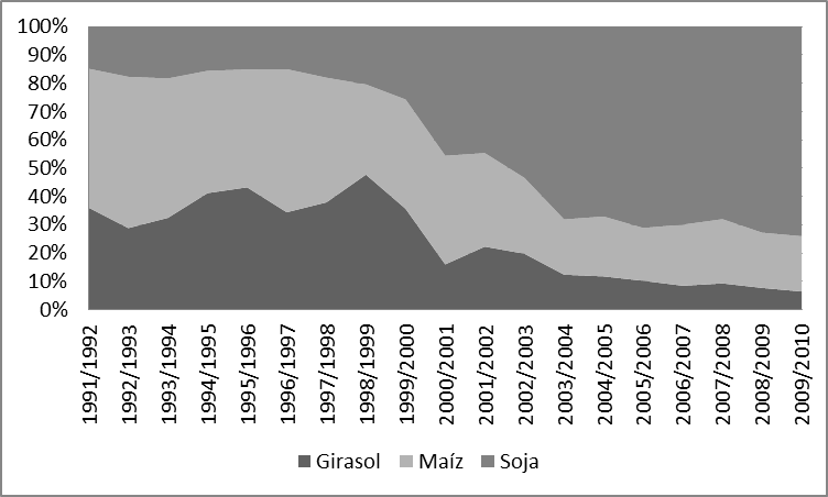 Desde inicios de la década de 1990 la superficie destinada al maíz y el girasol (los principales competidores naturales de la soja) no varió en demasía. No obstante, entre ambos cultivos, el más afectado ha sido el girasol que entre las campañas 1998/99 y 2000/01 redujo su superficie en más de 2.000.000 ha y en los dos últimos períodos mostró una caída de más de un millón de hectáreas para ubicarse en 1.542.945 ha. cultivadas. Esto lleva a pensar que la soja avanzó principalmente sobre campos destinados a otros usos pues el crecimiento a nivel nacional que ha tenido entre 1990/1991 y 2009/2010 es de más de 13 millones de ha.