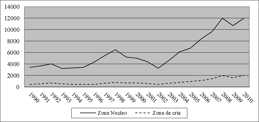 Al analizar el precio de compra de una hectárea en la pradera pampeana debe hacerse la misma salvedad que en el punto anterior pues las fertilidades, y por ende la posibilidad de obtener renta diferencial, afectan notablemente su valor de mercado. Por ejemplo, en los partidos de la zona deprimida del Río Salado, los precios de la hectárea en campos ganaderos se ubican, para abril de 2010, entre los 1500 y los 2500 U$S. Para aquellas tierras con aptitudes agrícolas los valores crecen exponencialmente hasta el techo de los 9000 U$S registrado en campos de General Belgrano, Monte y Lobos (Márgenes Agropecuarios, 2010: 38). Es por este hecho que el gráfico 9 recoge los valores promedio para las zonas de cría y núcleo (agrícola). Si bien la escala del gráfico sugiere que las variaciones de los precios de la zona agrícola son más pronunciadas, al comparar las variaciones porcentuales entre un año y otro puede observarse que los cambios en ambas líneas son casi simétricos. A partir de 2002 existe una tendencia alcista en el mercado de tierras que permitió que entre dicho año y junio de 2010 el precio de la hectárea se multiplicara en términos reales por 3,68 en la zona núcleo y por 4,38 en la de cría. Definitivamente ese es el período con mayores cambios pues si se comparan los precios deflactados de las tierras entre 1990 y 2010 se observa un aumento del 249,5% en el avalúo de las hectáreas en la zona núcleo y del 344% en el caso de los campos de cría ganadera. El mayor crecimiento de estos últimos puede vincularse a la reconversión que sufrieron muchas tierras ganaderas en pos del aumento de la superficie agraria, principalmente sojera como así también al escaso precio de las mismas en el inicio del período. Tal y como señala la teorización acerca de la renta diferencial y se registró en el caso de los arrendamientos, el aumento de los precios de la principal mercancía, en este caso la soja, impulsa la puesta en producción de las tierras con menos cualidades agrícolas, lo cual a su vez afecta los precios del mercado de tierras por crecimiento de la demanda. Esto explica la suba en el canon de arrendamiento y el precio de compra de las tierras ganaderas aun cuando la actividad transitaba una de sus peores crisis.