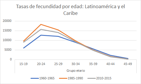 Para poder ejemplificar mejor la relación entre contextos socioeconómicos y fecundidad, el siguiente gráfico muestra el comportamiento de las tasas específicas por edad en tres periodos distintos en Europa del Norte, América Latina y en el mundo entero. Este gráfico permite observar dos aspectos centrales: Por un lado, el alto nivel de fecundidad de América Latina en comparación a Europa del Norte en los tres periodos estudiados; por el otro, se refleja claramente la maternidad tardía como un fenómeno instalado en Europa del Norte y emergente en América Latina. Esta última tendencia se puede observar en el número de nacimientos por mil mujeres entre los 20-24 y 30-34 años en el período de 2005-2010, en el cual el primer grupo etario está liderado por América Latina, mientras que el segundo, por Europa del Norte.