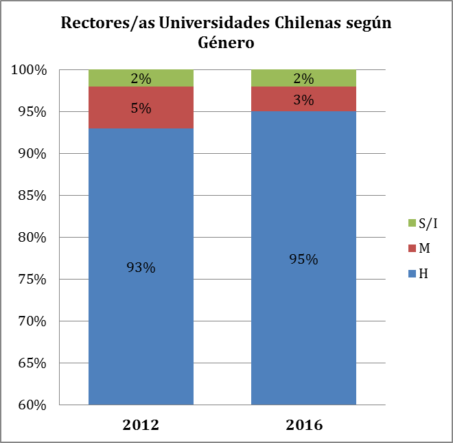 En conclusión, el sector de la educación superior da cuenta de una marcada segregación laboral vertical según género, la que se manifiesta en los tres puestos más altos de dirección de las organizaciones educacionales superiores (rector/a, decano/a y jefe/a de carrera). El fenómeno descrito llama especialmente la atención, puesto que es en estas organizaciones educacionales donde se esperaría una mayor presencia de fuerza de trabajo femenina en puestos de toma de decisión dada su alta participación laboral en este sector de la economía. Así mismo, se supone que son las universidades uno de los espacios de mayor reflexión crítica en torno al orden social vigente. Sin embargo y pese a la gran presencia de mujeres trabajando en las universidades como académicas, estos resultados muestran más bien organizaciones educacionales altamente masculinizadas en la construcción de sus jerarquías de poder. En efecto, si bien ha habido una creciente incorporación de fuerza de trabajo femenina en las universidades en las últimas décadas, dicha tendencia no ha tendido a traducirse en un claro mayor acceso a los puestos más altos de la jerarquía universitaria. Para alcanzar una comprensión de mayor largo plazo acerca de la segregación laboral vertical según género en las universidades en Chile, en las próximas páginas se discutirá un segundo estudio centrado específicamente en el acceso a las rectorías de las universidades chilenas durante el período 2012-2016.