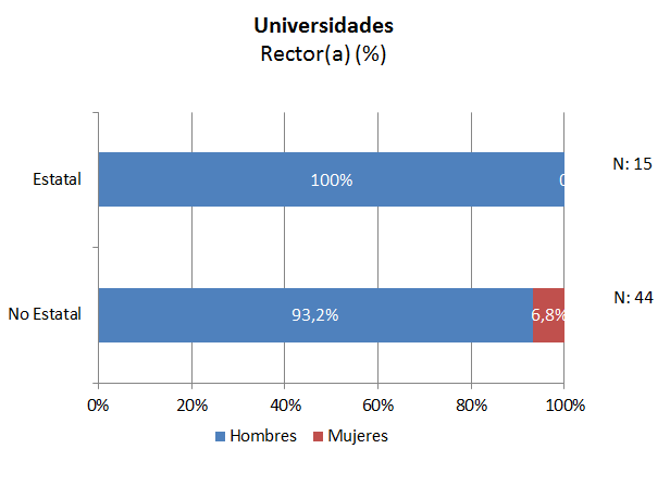 Especialmente claro se vuelve el fenómeno de la segregación vertical según género en las universidades respecto al acceso al puesto más alto de estas organizaciones: la rectoría. Los datos acá analizados muestran que incluso en el año 2016 dicho puesto de la jerarquía universitaria está exclusivamente reservado para docentes hombres. Esta tendencia se da tanto en las universidades estatales como privadas, sean “públicas” o no. Incluso en aquellos escasos casos donde una docente ha asumido dicho cargo es escasamente probable que sea reemplazada por una nueva rectora en el período siguiente.