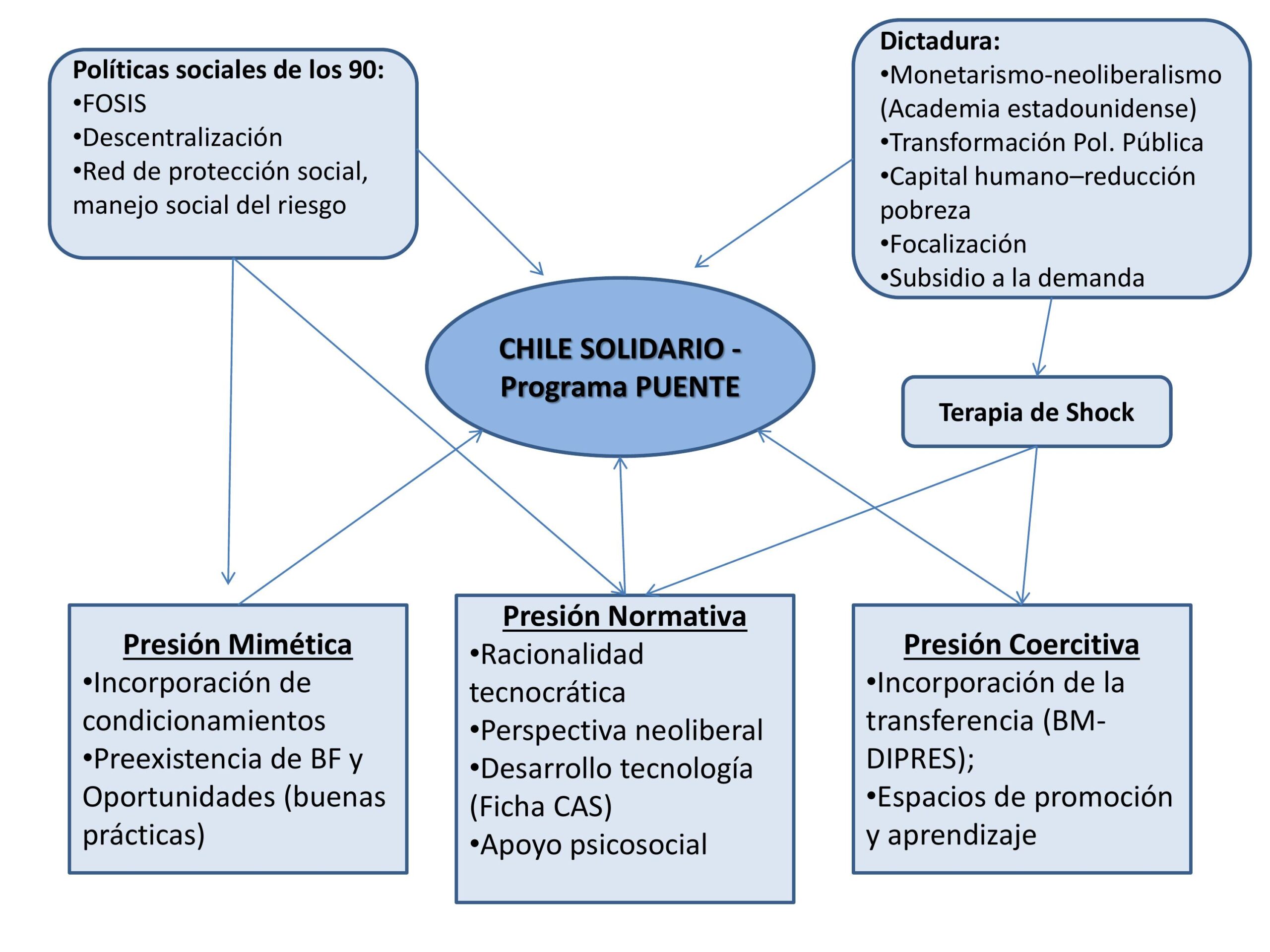 Después de lo expuesto para el caso del Programa Chile Solidario no pareciera que existió una presión coercitiva de los organismos internacionales. Más bien, este caso sugiere que los principales aportes en la relación entre el Estado chileno y este tipo de organizaciones se dio en el sentido contrario. Muchas de las propuestas que se rastrean desde tiempos de la dictadura aparecen como novedades en otros programas de la región, particularmente en las interpretaciones y resignificaciones de los organismos financiadores.