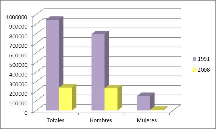 Respecto a la posibilidad de absorción de estas familias por parte de los nuevos conglomerados productivos, se ha comprobado sobradamente que existe una relación inversa entre el crecimiento del monocultivo tecnificado y la generación de empleos (Levy Sforza et al., 2018). De hecho, si tenemos en cuenta la alta demanda de mano de obra estacional que era requerida por el algodón y la inexistencia de un rubro comercial con características similares como reemplazo, la contracción de este cultivo tuvo repercusiones extremadamente graves para la fuerza de trabajo que se empleaba en su producción (OIT y PNUD, 2013). Como afirma Fogel Pedroso (2019), el trabajo asalariado temporal, demandado principalmente por las unidades productivas de pequeña escala, disminuyó entre 1991 y 2008 en un 75%. En este sentido, al comparar el CAN correspondiente a 1991 y el correspondiente a 2008, se observa un marcado descenso de los trabajadores temporales que supera los 700 mil trabajadores (MAG, 2008). [7]