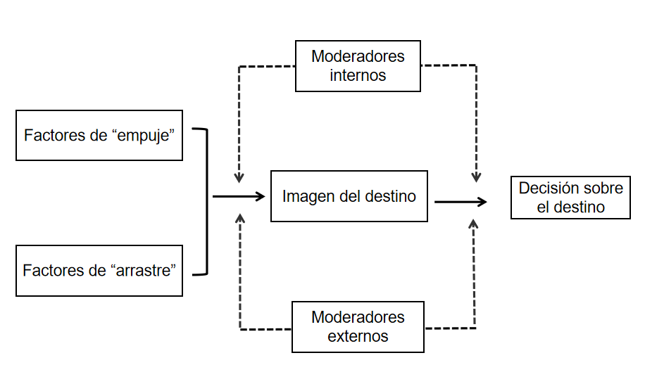 Los factores de empuje representan necesidades psicológicas intrínsecas que empujan a los turistas a viajar al extranjero. Es decir, serían como sus propias motivaciones para viajar. Por ejemplo, conocer lugares diferentes, visitar a amigos o familiares, desarrollar relaciones sociales, etc. Dann (1977) ha identificado la anomia y la mejora del ego como dos importantes motivos de viaje, que considera como factores de empuje. Por otra parte, los factores de arrastre son factores del destino que “tiran” del turista, es decir que le atraen hacia ese destino; por ejemplo, arte, historia y cultura, calidad de los servicios turísticos, de las infraestructuras, política y economía, ambiente, etc. Crompton (1979a) fue uno de los primeros autores que distinguió entre los factores de empuje y arrastre, identificando dos grupos de motivaciones de viaje. Uno integra motivaciones sociopsicológicas consideradas como factores de empuje: escapar de un entorno habitual percibido, autoexploración y evaluación, relajación, prestigio, regresión (o revivir comportamientos pasados), mejora de las relaciones de parentesco e interacción social. El otro grupo se refiere a motivaciones culturales consideradas como factores de arrastre, que son novedad y educación. En cuanto a la relación entre factores de empuje y de arrastre, Crompton (1979a) ha destacado que ambos no deben tratarse como si operaran de manera totalmente independiente entre sí. Mientras que Klenosky (2002) cree que ambas partes no son exclusivas ni tampoco completamente independientes.