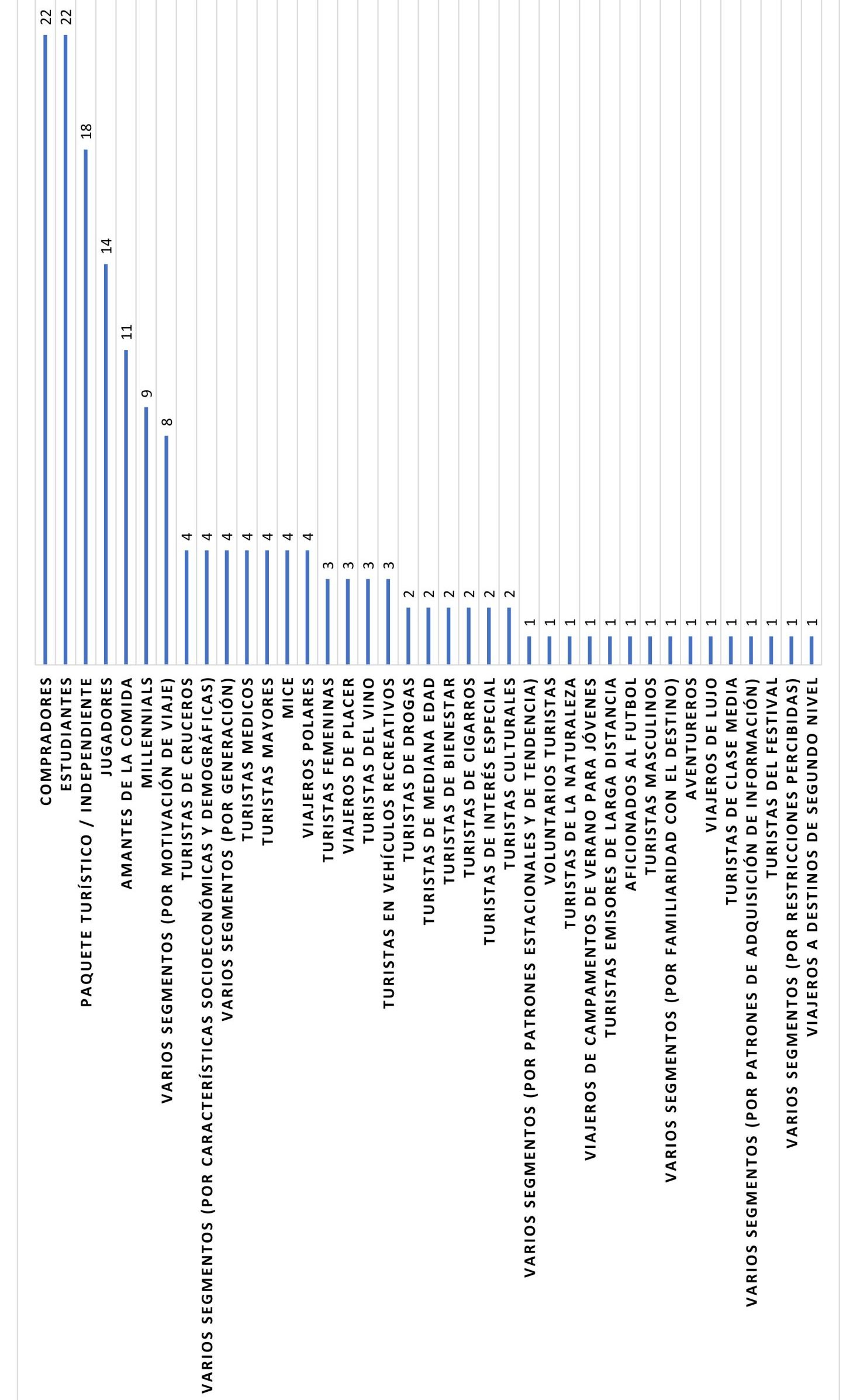 Finalmente, con respecto a los segmentos analizados, la mayor cantidad de artículos se enfocan en compradores y estudiantes (22 artículos cada uno), seguidos por aquellos que analizan paquetes turísticos/ viajeros independientes (18), jugadores de casino (14), amantes de la comida (11) y millennials (9). La Figura 10 muestra la distribución de artículos por segmento.