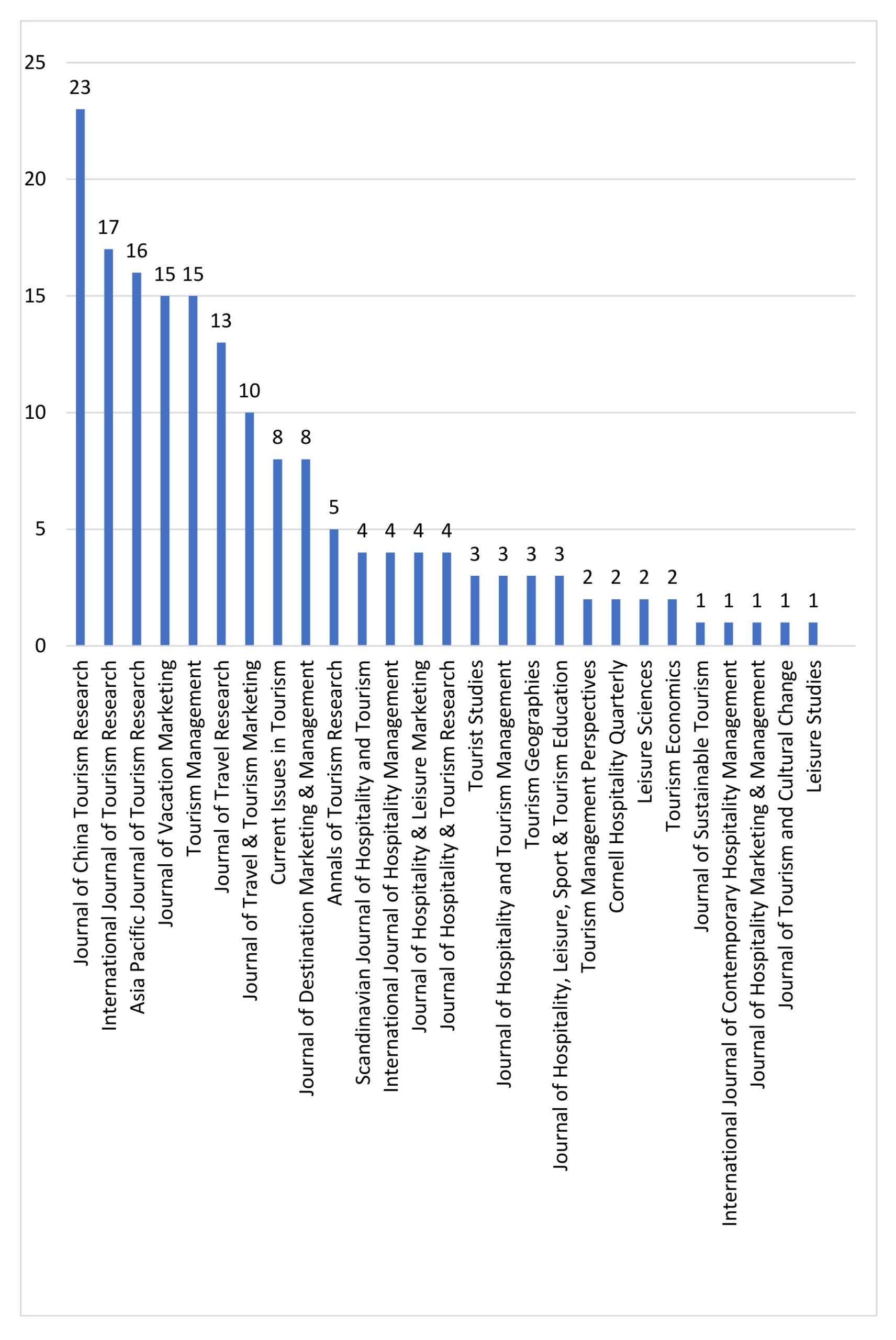 La revista que ha publicado el mayor número de artículos fue Journal of China Tourism Research (23 artículos), seguida de International Journal of Tourism Research (17), Asia Pacific Journal of Tourism Research (16), Journal of Vacation Marketing (15), Tourism Management (15), Journal of Travel Research (13) y Journal of Travel & Tourism Marketing (10). Cabe señalar que cuatro revistas no publicaron ningún artículo que cumpliera con los criterios durante el período analizado: Journal of Hospitality and Tourism Technology; Journal of Leisure Research; Journal of Outdoor Recreation and Tourism; y Tourism Review. La Figura 6 muestra la distribución de artículos por revista.