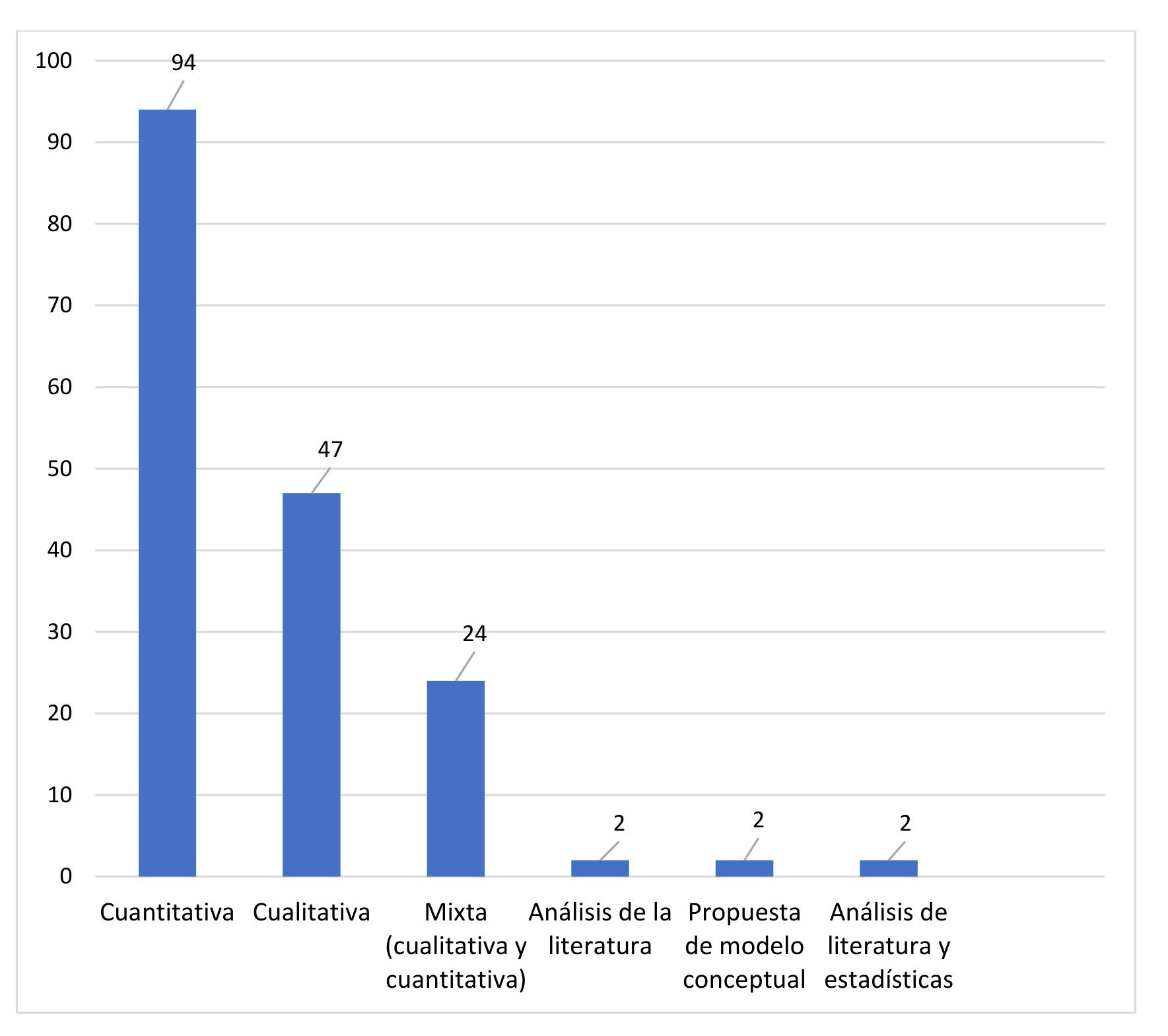 En cuanto al tipo de artículo, los artículos empíricos prevalecen claramente (165) sobre los conceptuales (6). La metodología cuantitativa domina (94) sobre la cualitativa (47) y la mixta (24). En cuanto a los métodos de investigación específicos, la mayoría de los artículos se basan en encuestas (87), seguidos de los basados en entrevistas en profundidad (31) y los que adoptan un enfoque mixto cuantitativo-cualitativo basado en una combinación de ambas metodologías (24). La Figura 9 ilustra la distribución de artículos por métodos de investigación.