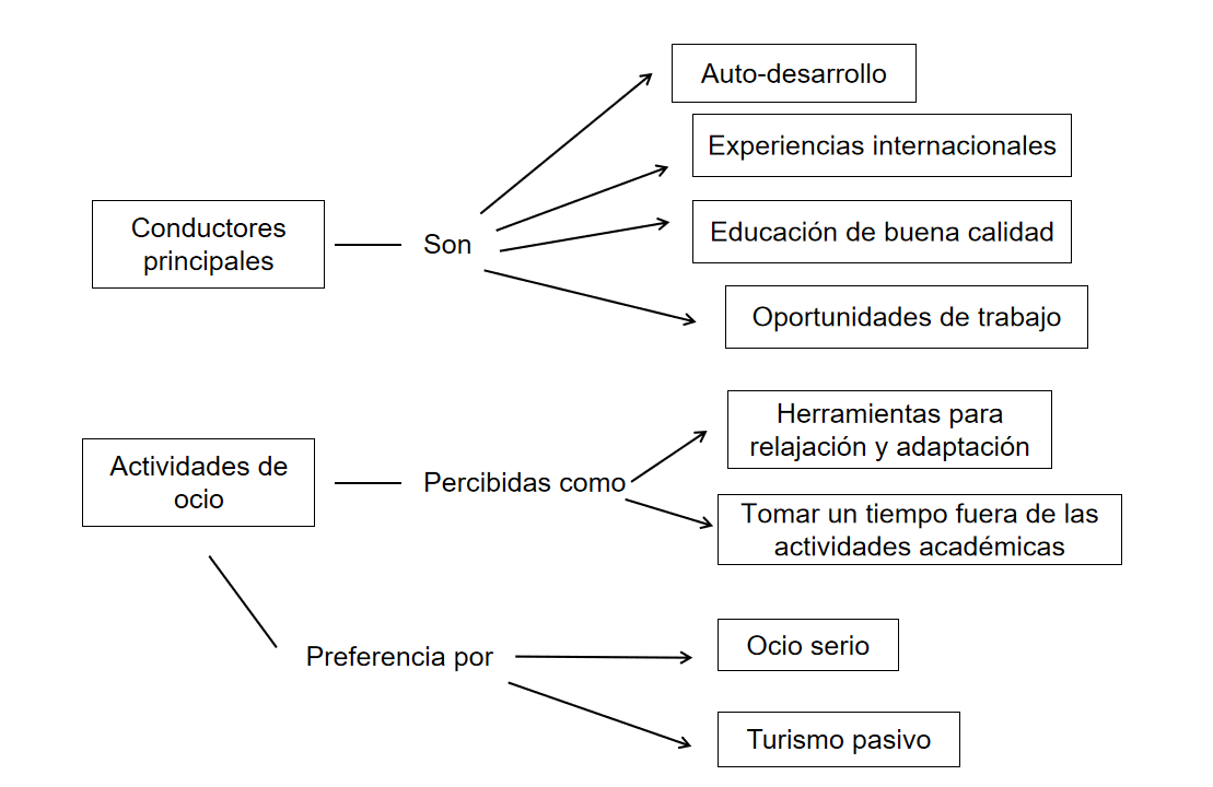 A modo de síntesis, sus principales motivaciones para estudiar en el extranjero son el autodesarrollo (tanto relacional como individual), el aprendizaje intercultural, el acceso a una educación de alta calidad y la búsqueda de mejores oportunidades laborales. Sus actividades de ocio durante su estancia en el extranjero muestran algunas características distintivas: las necesidades de relajación actúan como un conductor; el ocio a veces se percibe como quitar tiempo a las tareas de estudio; el ocio serio contribuye al apoyo social y la adaptación escolar; y las actividades pasivas pueden ser preferidas debido a razones culturales asociadas con no “perder la cara”.