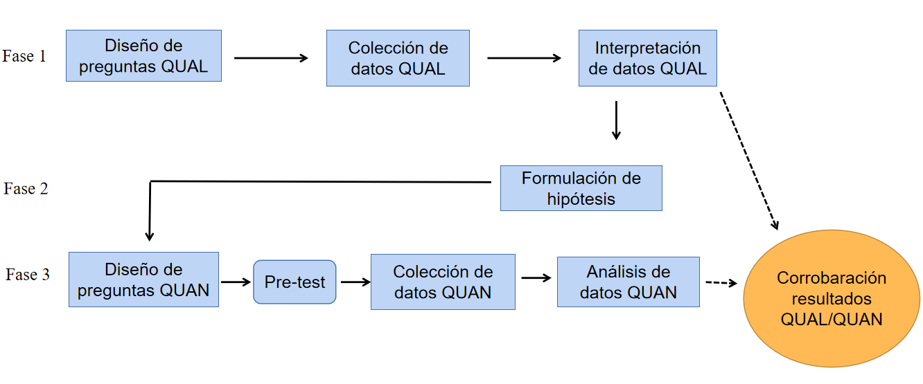 En conclusión, la primera fase QUAL permite conocer más sobre el contexto para la selección de la muestra, el instrumento, el uso de variables y medidas específicas y la formación de hipótesis (Creswell, 2015). Con base en ello, la fase QUAN se efectuará mediante encuestas a un mayor número de personas para contrastar y generalizar los resultados. Entonces, la recogida de datos se va a hacer en dos fases (primero, fase cualitativa y luego cuantitativa) que tienen la misma relevancia. Por lo tanto, la implementación será secuencial o bifásica y la prioridad equivalente (Molina-Azorín, 2007).