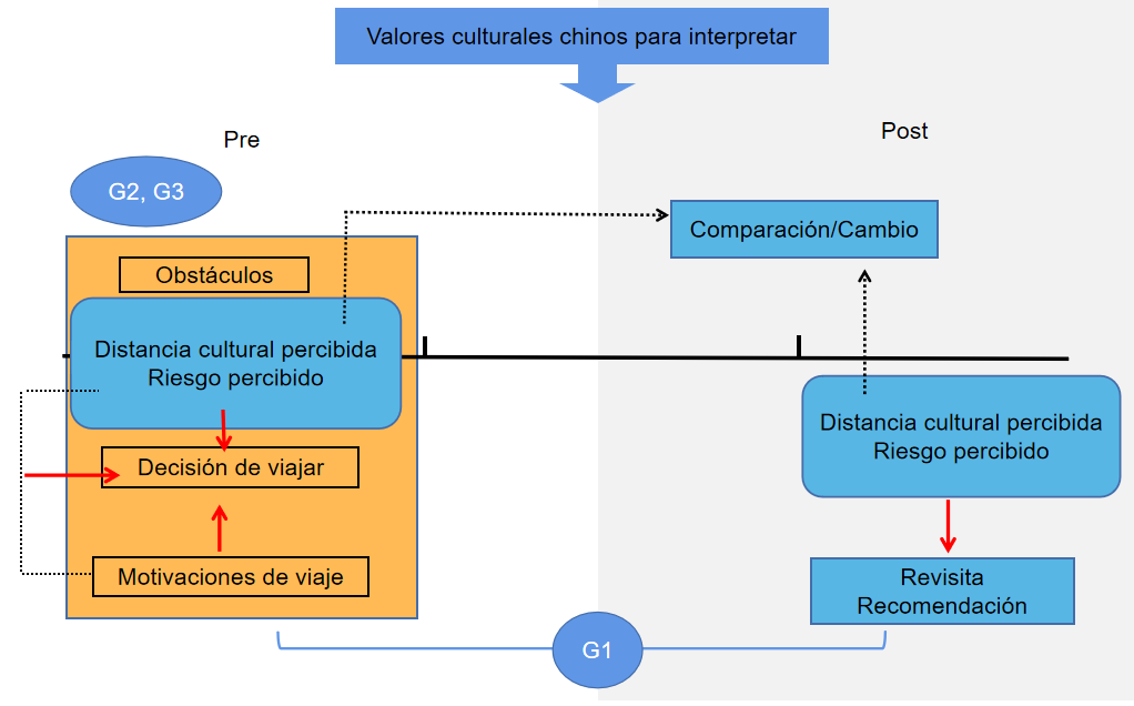 A nivel del turista individual, Bi (2017) descubrió que la distancia cultural percibida impacta en la elección del destino mediante la novedad y el riesgo percibido. Concretamente, la distancia cultural percibida afecta positivamente a la intención de elección del destino de los turistas a través de la percepción de novedad e influye negativamente en la intención de elección del destino de los turistas mediante el riesgo percibido. Sin embargo, no existe investigación empírica suficiente que estudie si la distancia cultural percibida significa más novedad o riesgo para los turistas chinos, es decir, ¿cómo es el peso de novedad y de riesgo en la percepción de los chinos, frente a las diferencias culturales?