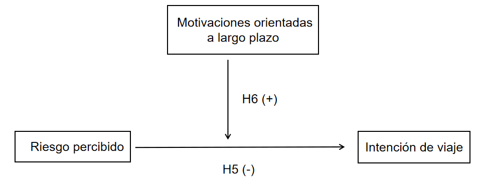 - Hipótesis 6. Las motivaciones orientadas a largo plazo tienen un efecto moderador sobre la relación entre el riesgo general percibido por los turistas chinos y su intención de viajar a América Latina.