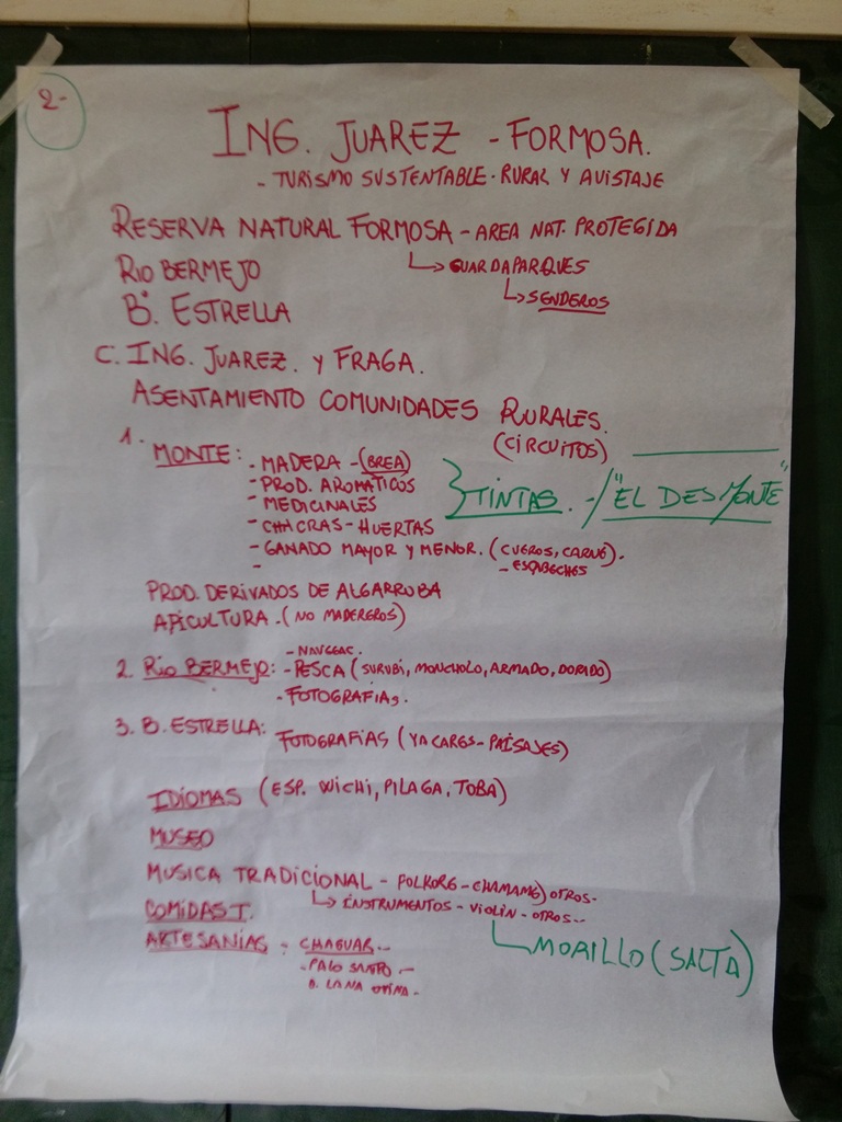 A modo de ejemplo, destacamos el resultado de los talleres de trabajo coordinados por quienes suscriben en las IV Jornadas de Medios de Vida Sostenible, ciudad de San Pedro, Misiones (septiembre 2015) con productores y comunidades originarias de la región. Como dinamizadores, pudimos trabajar con ellos para ir desde el “todo está hecho” a descubrir que “hay mucho por hacer”. Como caso, los representantes de Ingeniero Juárez, Formosa, identificaron recursos y saberes locales, para detectar oportunidades: safaris fotográficos, senderos de interpretación y valoración del bosque nativo, excursiones de pesca, dialectos, entre otros.