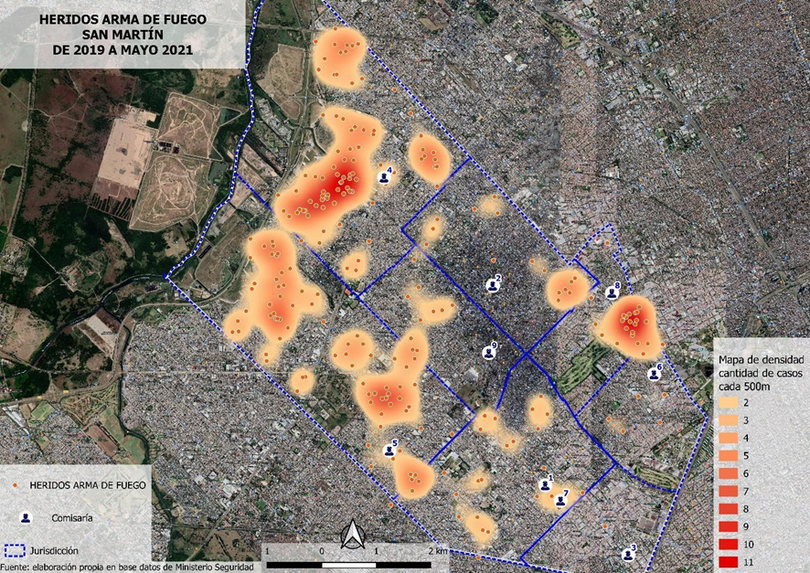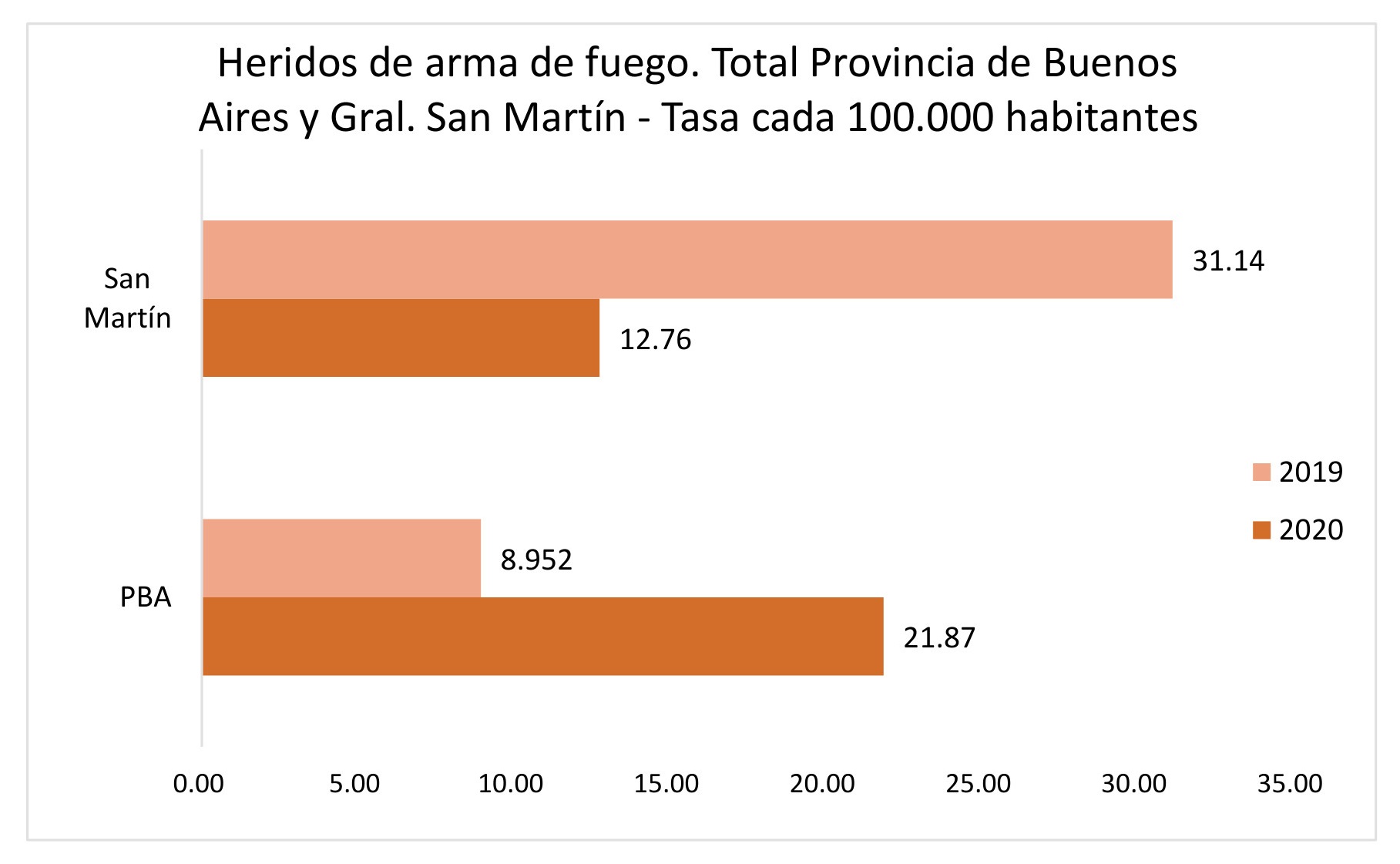 Según el Sistema Nacional de información Criminal (SNIC), los hechos de violencia potencialmente letales que no llegan a tener consecuencias mortales –por ejemplo, los heridos por armas de fuego– aumentaron de manera significativa en toda la provincia de Buenos Aires entre 2019 y 2020. En efecto, en 2019, hubo 1555 casos, lo que arroja una tasa de 8,95 por cada cien mil habitantes. En 2020 hubo 2238 casos; es decir, una tasa de 12,75 por cada cien mil habitantes. Mientras tanto, en San Martín, la cantidad de heridos con armas de fuego disminuyó en ese mismo período. En 2019 hubo 132 (lo que arroja una tasa cada 100.000 habitantes de 31,14) y en 2020 hubo 92 (21,86 de tasa cada 100.000). Pero, como ilustra el cuadro siguiente la tasa de heridos de arma de fuego resulta ser más alta en San Martín que a nivel de la provincia de Buenos Aires.