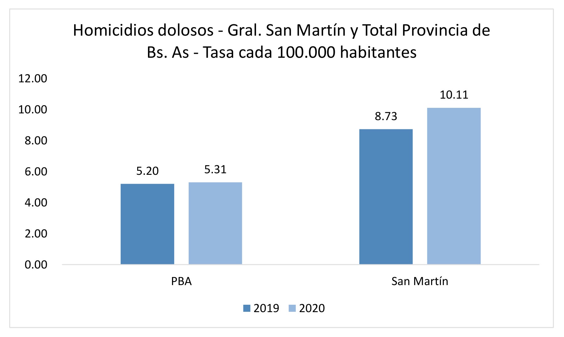 Por otro lado, en el caso de los homicidios dolosos los datos resultan ser diferentes. Mientras que en toda la provincia de Buenos Aires los homicidios permanecieron estables entre 2019 y 2020, en Gral. San Martín subieron y de forma muy significativa. A nivel provincial, la variación de la tasa cada 100.000 habitantes fue de 5,2 a 5,3. En cambio, en el partido de Gral. San Martín en el 2019 murieron 37 personas en homicidios dolosos y 43 en 2020. De esta forma, la tasa de homicidios dolosos aumentó un 16%.