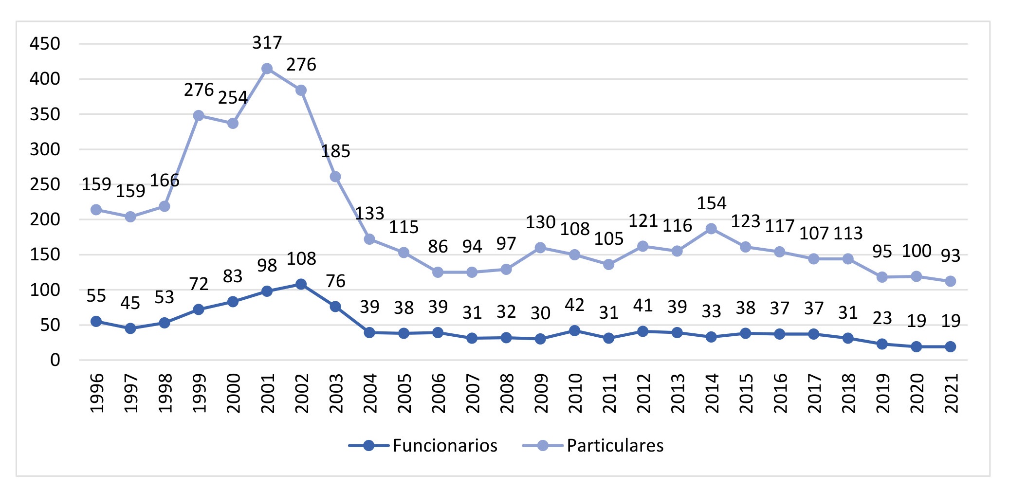 Cuadro 1. Particulares y funcionarios de seguridad muertes en hechos de violencia con participación de funcionarios de fuerzas de seguridad. CABA y Conurbano, 1996 a 2021