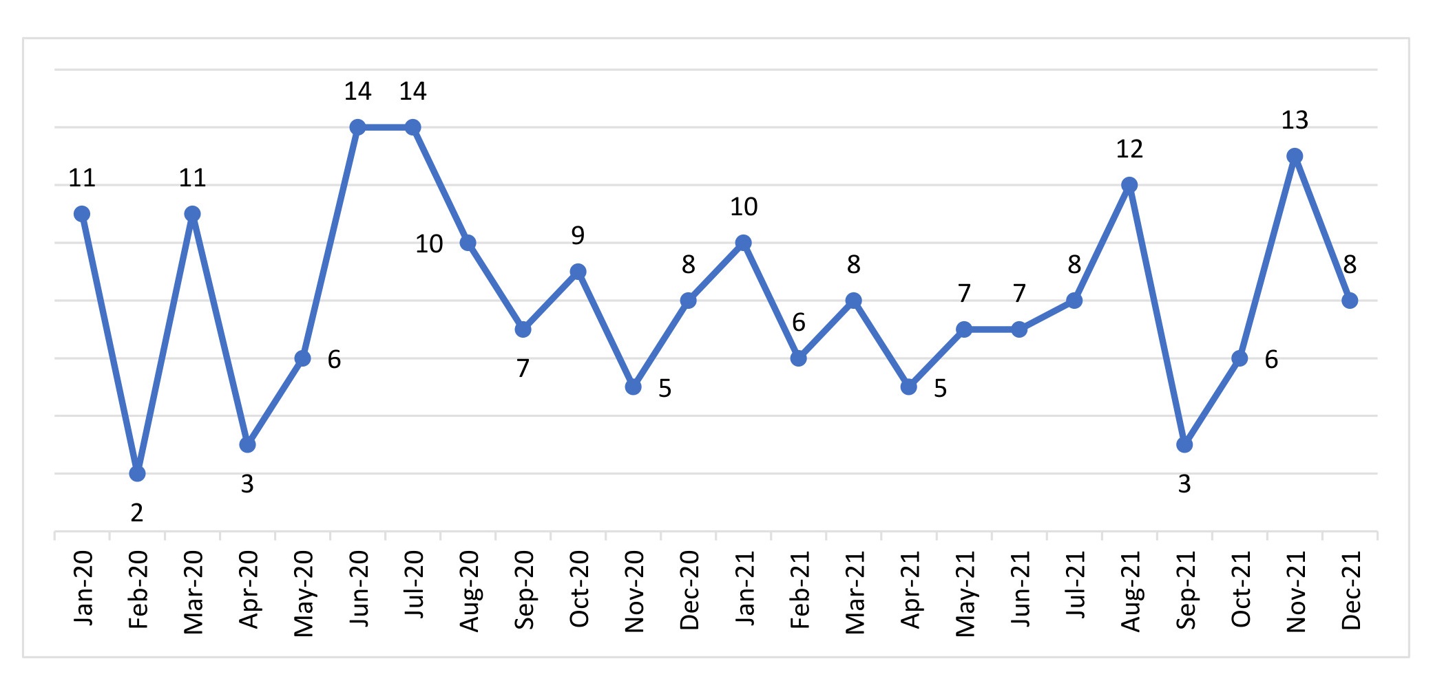 Cuadro 2. Cantidad de particulares muertes en hechos de violencia con participación de funcionarios de fuerzas de seguridad. CABA y Conurbano Bonaerense. Evolución mensual enero 2020 – diciembre 2021