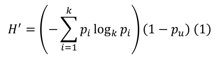 Donde k es el número de diferentes cubiertas del suelo (hábitats potenciales) en el área de estudio, y k+1, el total de cubiertas posibles en cada celda de la matriz territorial. Consideramos que la presencia de cubiertas urbanas resulta en una pérdida de hábitats potenciales. Entonces pi es la proporción de cubiertas del suelo i en cada celda.