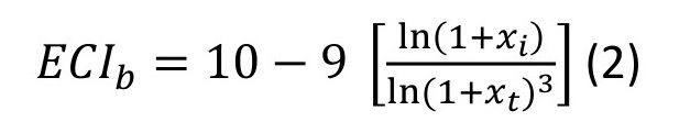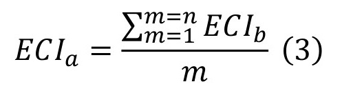 Donde xi es el valor de la suma del costo de distancia por pixel y xt el costo de distancia teórica máxima. ECIa es el índice absoluto de conectividad ecológica (ecuación 3):