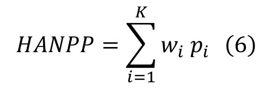 Donde wi mide el peso de la cobertura del suelo i, y pi, la proporción de la cobertura del suelo i en el área de estudio. Las variaciones del HANPP dependen tanto de las variaciones de p como de las de i.