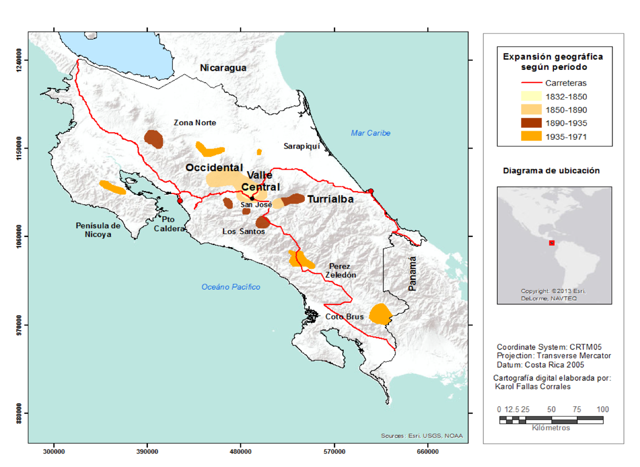 Durante el siglo xix, la falta de infraestructura y la escasa población limitaron la expansión cafetalera. Fue en la segunda mitad del siglo xx cuando un ambiente económico, político, social y de mercado favorable permitió llevar el cultivo fuera de las regiones tradicionales. La construcción de la Carretera Interamericana fue una obra de infraestructura clave. Su construcción habilitó tierras aptas para la agricultura tanto en regiones cafetaleras tradicionales (donde la frontera agrícola continuó abierta), como en nuevas regiones (región Tarrazú, región Brunca, región Pacífico), y algunas de estas tierras se aprovecharon para el cultivo del café (mapa 1).