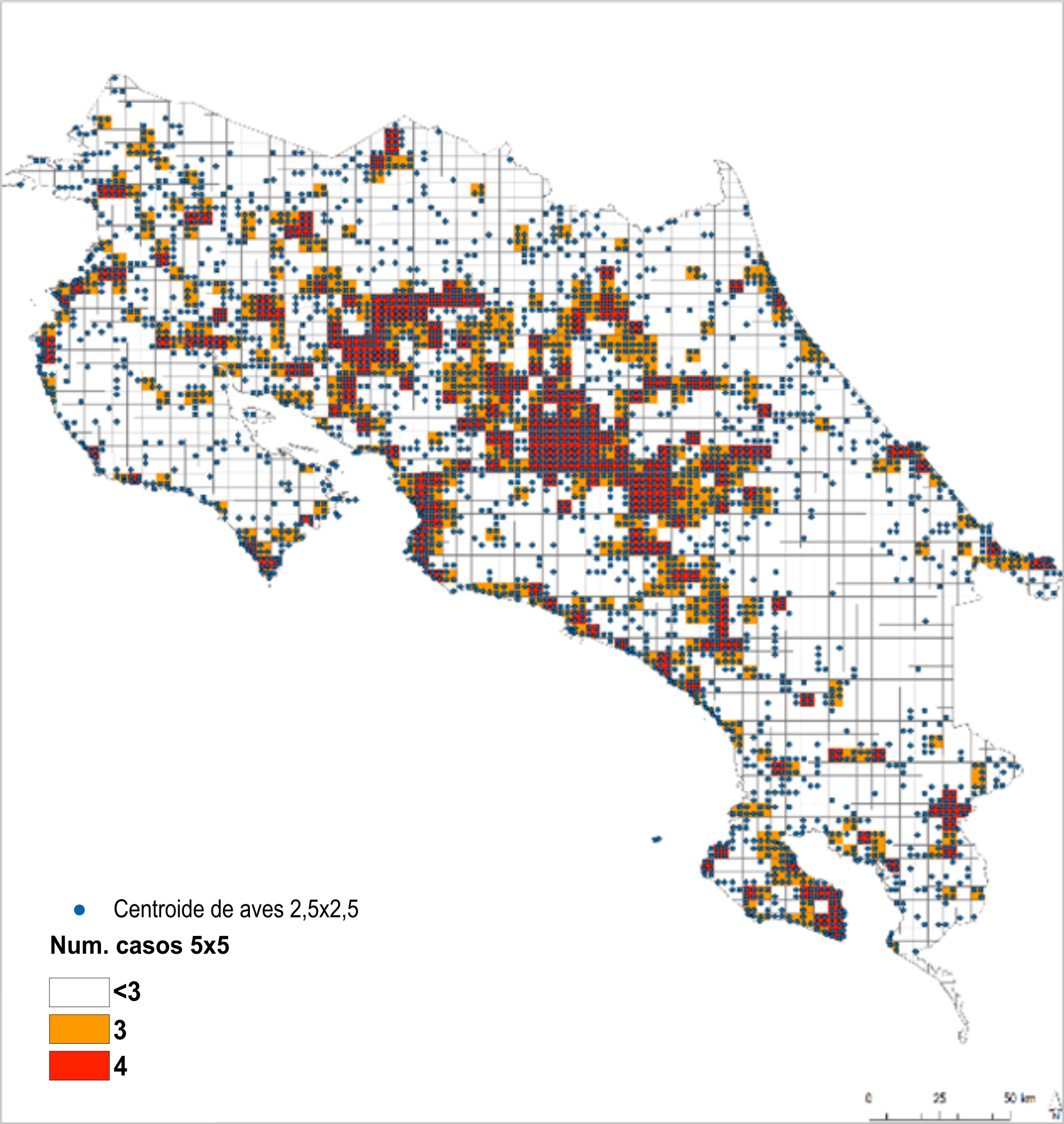 Para testear las métricas metabólicas de composición y configuración del paisaje, utilizamos como bioindicador la riqueza de especies de aves. La información la obtuvimos del Instituto Nacional de Biodiversidad de Costa Rica (INBIO).[60] Este, a partir del mapa de provincias de Costa Rica publicado por el Programa de Regularización del Catastro y Registro en el Sistema Nacional de Información Territorial, generó un mapa en cuadrículas de 2.5 x 2.5 km que muestra la riqueza de especies de aves. Para ello INBIO se basó en los registros de la Infraestructura Global de Información en Biodiversidad (GBIF). En nuestro análisis escogimos aquellas celdas 5 x 5 km que registraron tres o más subceldas 2.5 x 2.5 km muestreadas, para evitar sesgo en la intensidad de muestreo (en la información original de INBIO, existen claras evidencias de un muestreo desigual en el territorio). Partimos de un análisis estadístico de regresión lineal controlando la autocorrelación y la multicolinealidad de los datos (mapa 3). Dividimos las celdas por la superficie y la intensidad de muestreo, y trabajamos con escalas logarítmicas para evitar la heterocedasticidad.